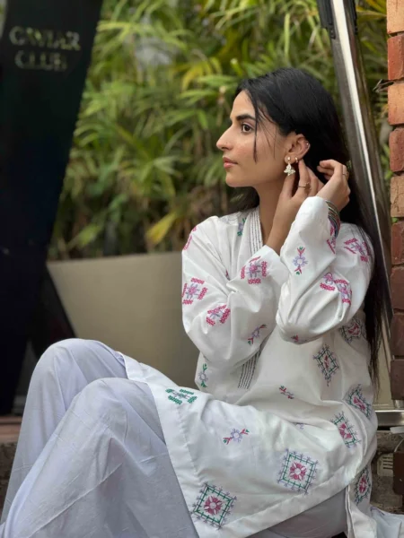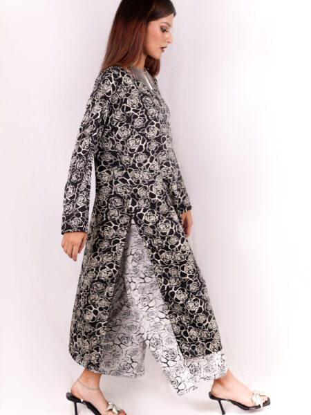 Muted allover printed shirt enhanced with lace on neck line and stones on hem and sleeves end. It is paired with printed belt-style shalwar.
