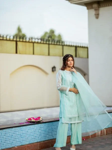 - 26 % Off ₨ 6,990.00Original price was: ₨ 6,990.00.₨ 5,190.00Current price is: ₨ 5,190.00.Drape yourself in elegance with this striking 3-piece navy blue ensemble, perfect for festive evenings. The organza shirt features shimmering sequin detailing that adds a touch of glamour, beautifully paired with a sparkle-embellished organza dupatta. The look is completed with a flowy silk umbrella-cut trouser that enhances movement and grace.…
