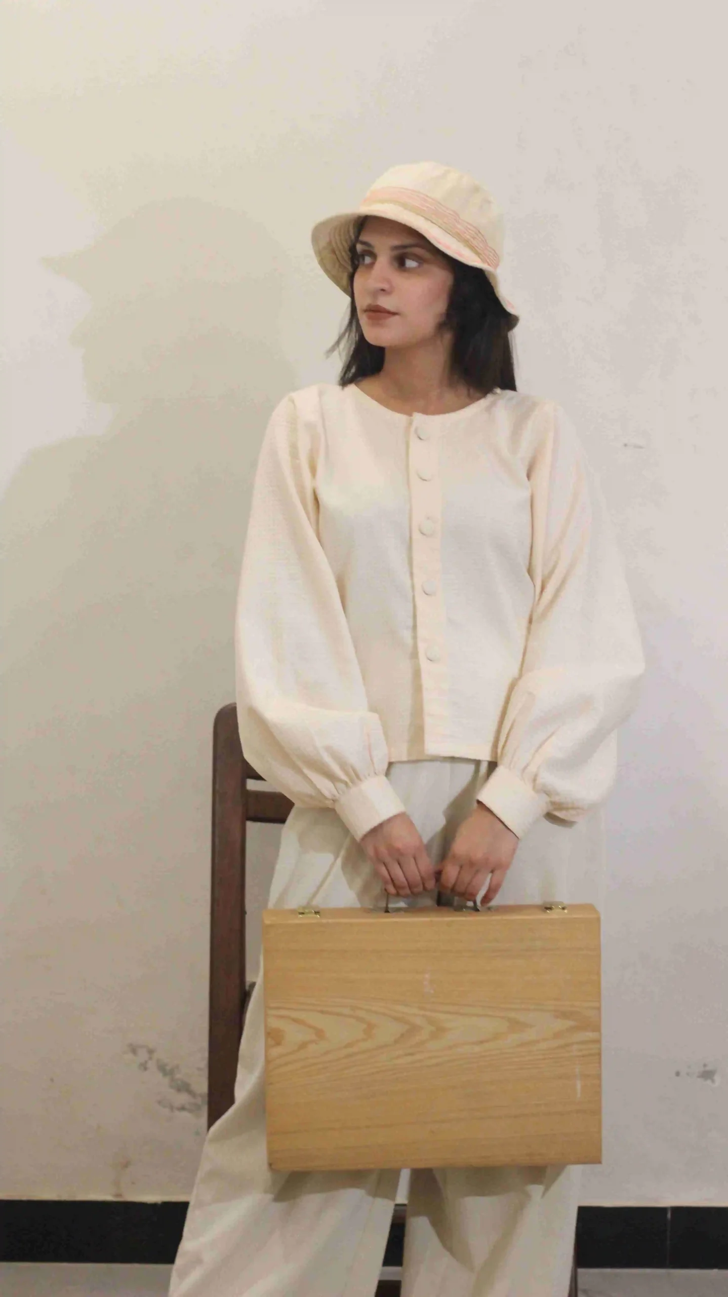 Crafted from textured fabric with a refined finish, this top embodies quiet luxury. Elevated with statement button detailing and voluminous sleeves, it’s where chic design meets timeless fashion.